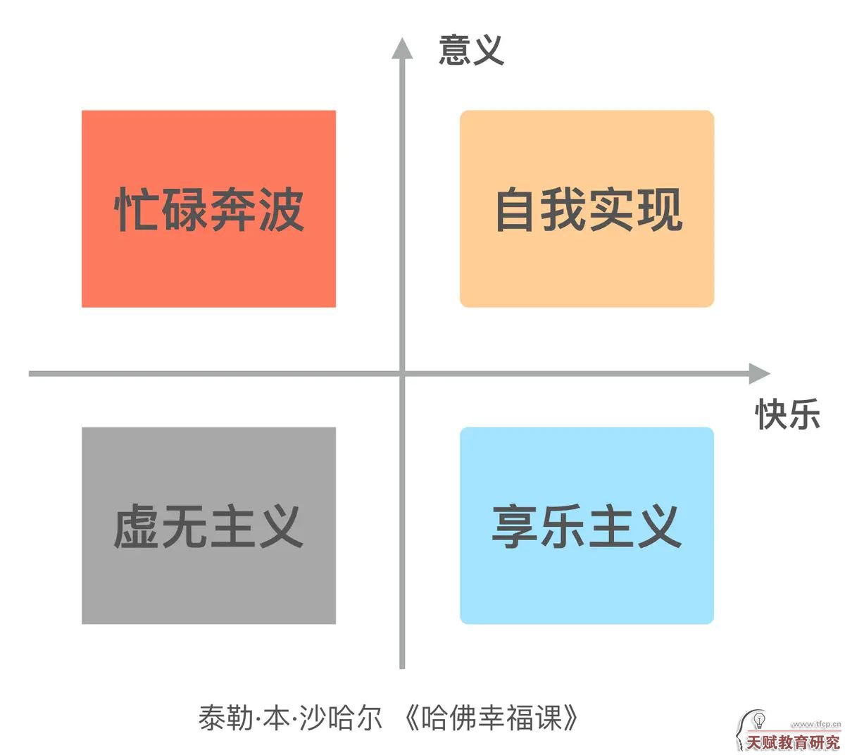 如果把快乐和意义作为2个要素,你可以把人群分成4种类型,即 自我实现型、盲目奔波型、享乐主义型和虚无主义型 。