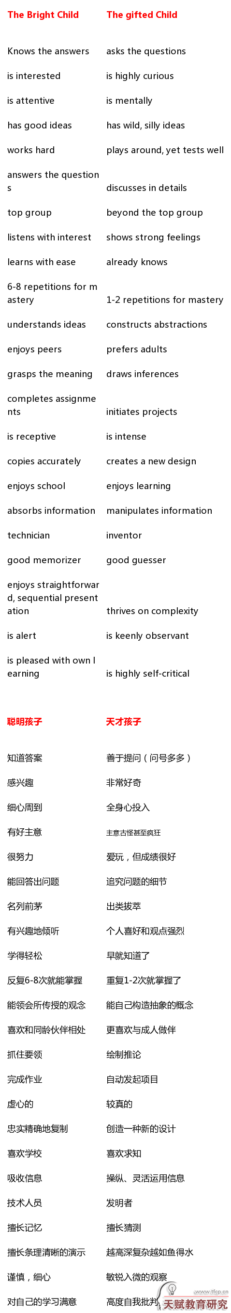 天才班第一次上课时,老师给了一些材料。其中一份是把聪明孩子与天才孩子做个比较,我觉得挺有意思,也颇受启发,就收藏了。下面是英文原文和中文翻译。