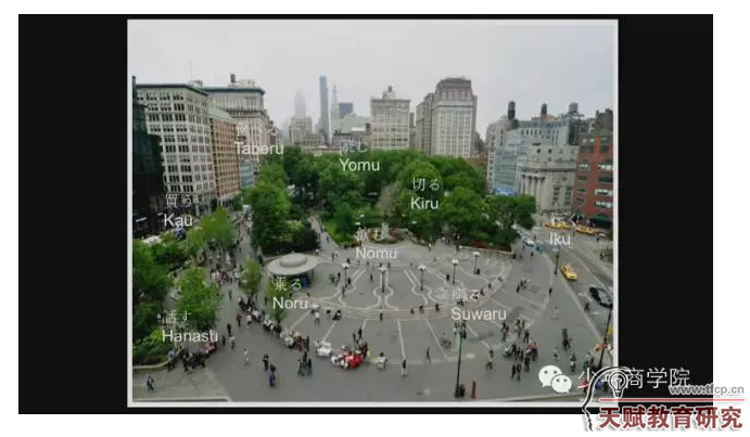 假设你想要学清单上的这10个单词,不要单纯地背,而是把单词和自己的空间记忆结合起来。上图是联合广场,Tim每天都会去那里,想象他正走在联合广场,每个单词都被对应到一个位置上:走在大街上,日语是“iku(走)”,我再往前走一遍,右转,坐在我可以suwaru(坐)的阶梯上,左前方是华盛顿雕像,我以前以为那是个喷水池,所以就是nomu喝……